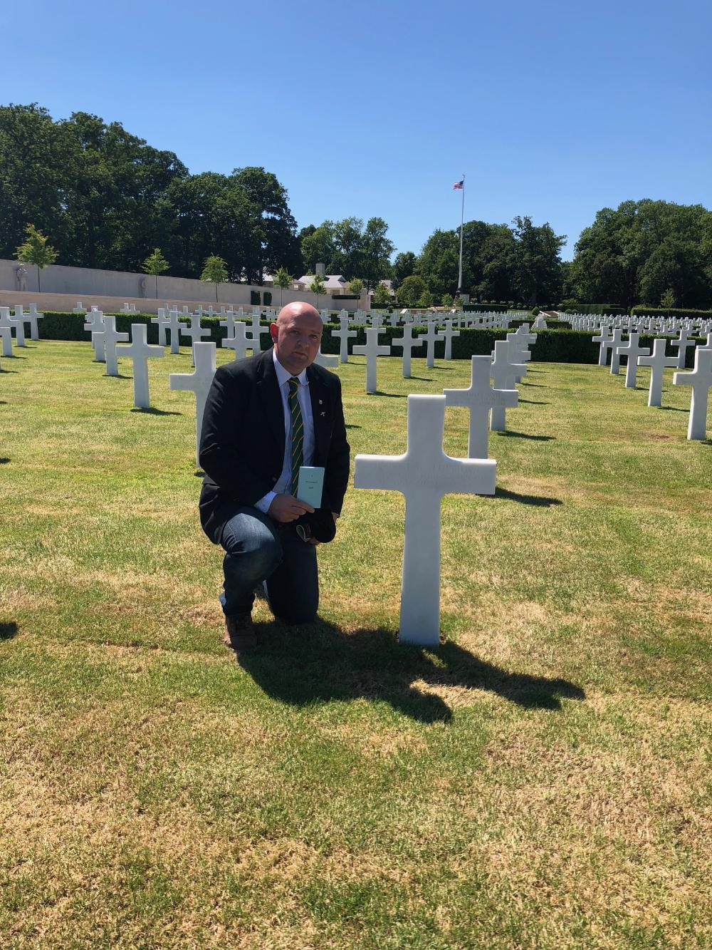Thulai van Maanen of the Netherlands arranged a flower arrangement and waited for the jumpers on the dropzone to tell GBT's story to the group. After their jump and after GBT's story the booklets were handed out to the jumpers by 101st Airborne and WW2 veteran Vincent Speranza. After this small ceremony the Round Canopy Parachuting Team placed the flower arrangement at the La Fiere Monument. Thulia left GBT's picture there too.